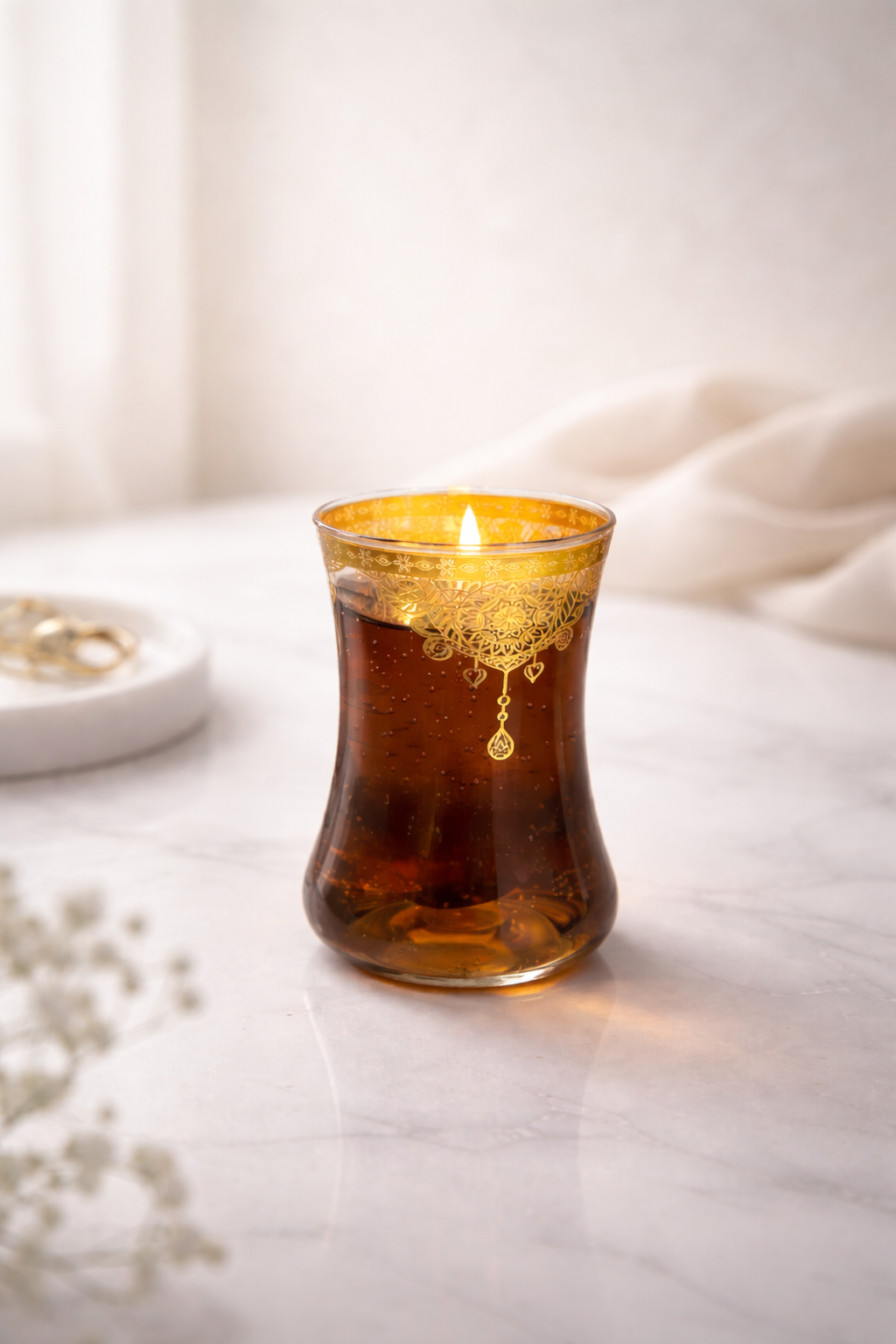 Unsere Turkish-Tea-Kerze wird in einem originalen Teeglas gegossen – genau jener eleganten Glasform, in der traditionell Çay serviert wird.